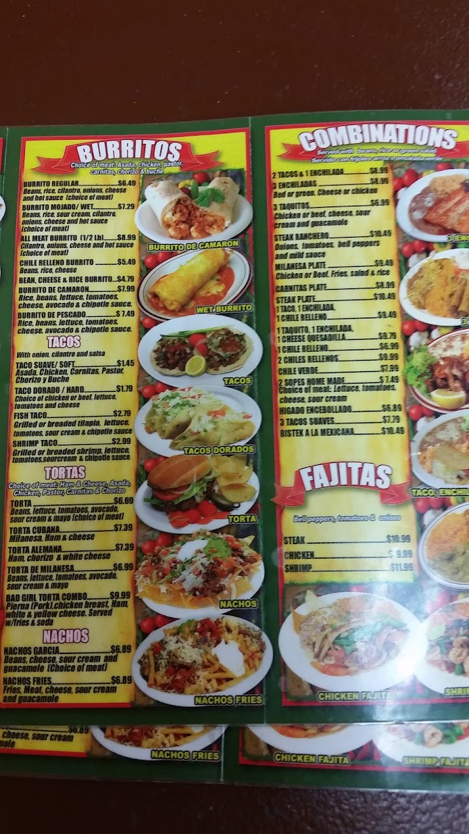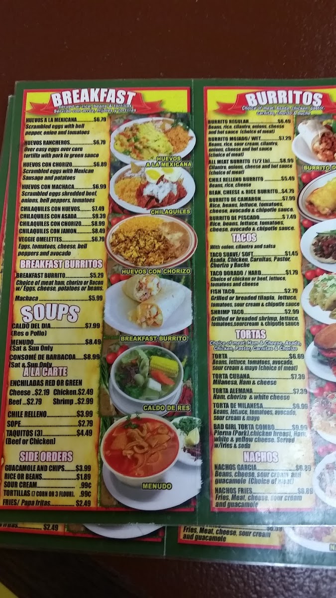 Side dishes like Tortillas and the mouthwatering Nachos Garcia or Nachos Fries make great additions to any meal. If you're craving something heartier, the Tortas menu is full of options, with choices like the Torta Alemana, Torta De Milanesa, and the decadent Bad Girl Torta Combo.